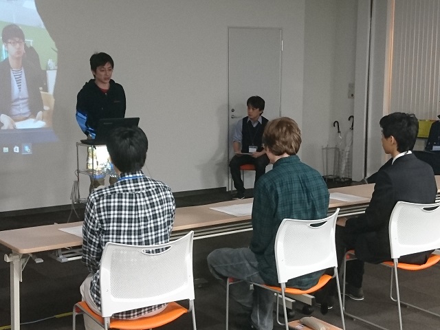 ▲札幌本社勤務の3名と仙台支社勤務の1名。仙台支社とはskype通話をしながら入社式を行いました。