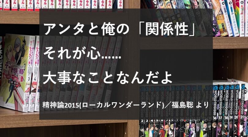 そこで、関係性の話です。心がカラッポで認識しかないのであれば、認識があって初めて「空」であるところの心がある。そのため心というものは認識次第、他のもの次第になってくる。特に他人というのは人間にとって一番の関心事であるため、他人とどう関わるか・どう接するかは、人の心を大きく左右するでしょう。人だけでなく物事との関係性も心を形成するけれど、人との関係性が心を形成する大きな要素になりうる。そんなふうに私は考えています。