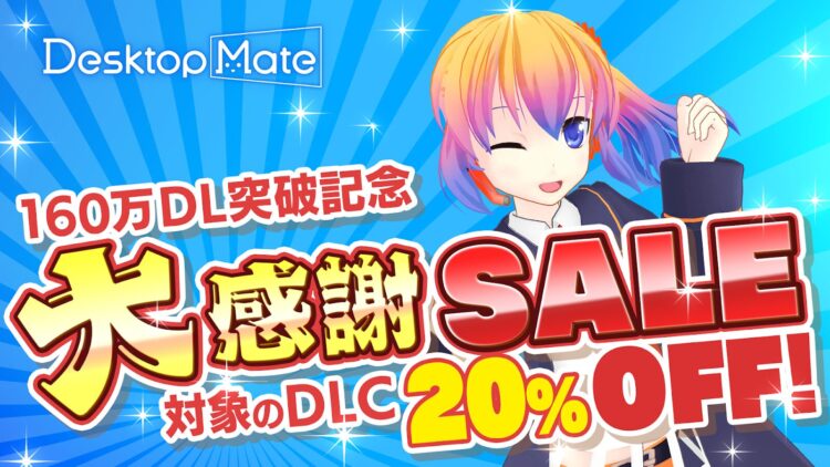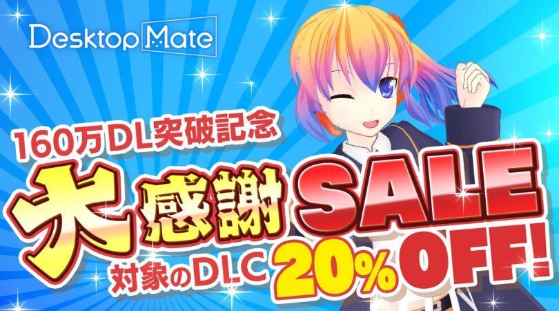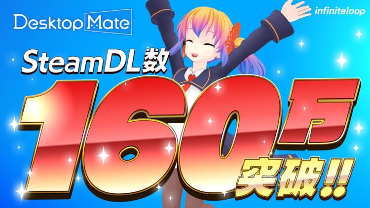 「Desktop Mate」は2025年1月8日の配信開始以降、約8ヶ月という期間で160万ダウンロードを突破いたしました。前回の150万ダウンロード達成からわずか2ヶ月での快挙となり、継続的なご支援をいただいている皆様に心より感謝申し上げます。