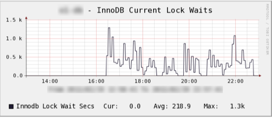 上のグラフでは、ちょうど Questions と同じ時間帯で Lock Waits も上昇しています。表示中の k はキロ、1000 です。2つ合わせるとエラーが増加してロックの待ち時間も増えている、となります。MySQL だと真っ先に疑われるのはデッドロックですが、この例では INNODB STATUS を見ても記録されていませんでした。さてどうしたものか?そこで生きてくるのが次の3点目のグラフです。