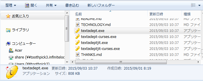 ダウンロードした zip ファイル (2015年9月3日現在バージョン 8.2 ) をお好きなフォルダに置き、解凍してください。解凍したフォルダの中の textadept.exe をダブルクリックして起動します。
